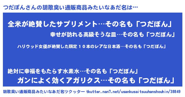 | 意味不明あだ名 | 『住所不定無職つだぼん(56歳)』 |