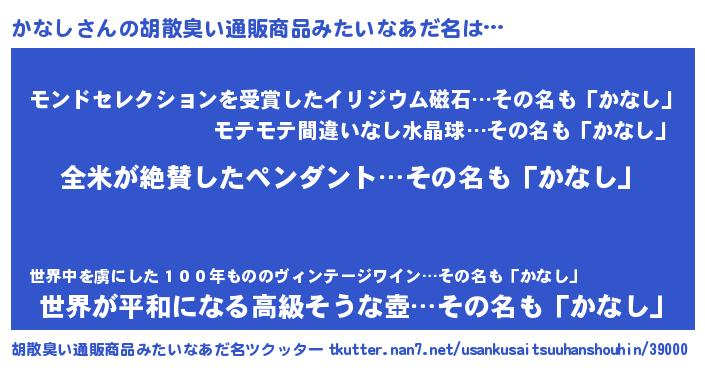 | 男性向けラノベタイトル風あだ名 | 『かなしの嫁は女の子じゃないと思った?』 |
