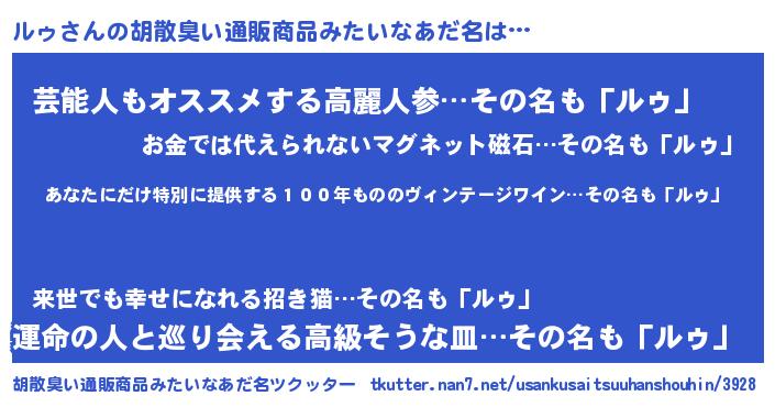 | 意味不明あだ名 | 『住所不定無職ルゥ(2歳)』『自称ルゥ』 |