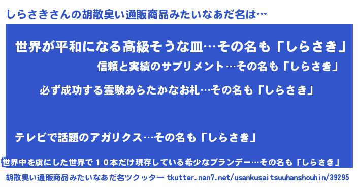 | 男性向けラノベタイトル風あだ名 | 『しらさきの憂鬱』『魔弾の王としらさき』 |