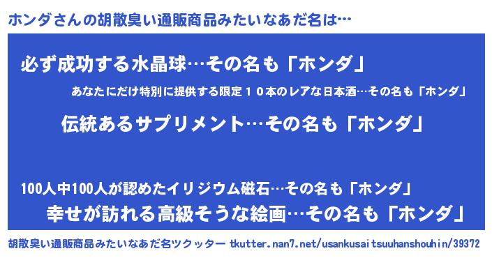 | 欧米人風あだ名 | 『アンジェラ・ホンダ』『ウサインホンダ』 |