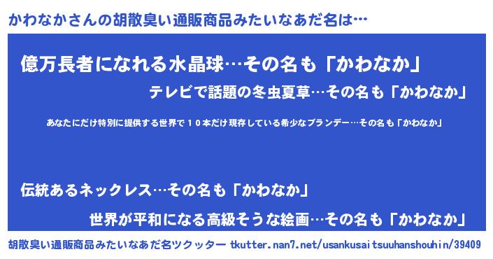 | 意味不明あだ名 | 『住所不定無職かわなか(89歳)』 |