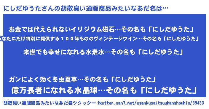 | ヘコむあだ名 | 『にしだゆうた(震え声)』『にしもー』 |