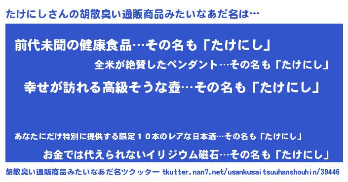 | 男性向けラノベタイトル風あだ名 | 『やはりたけにしの青春ラブコメはまちがっている 』 |