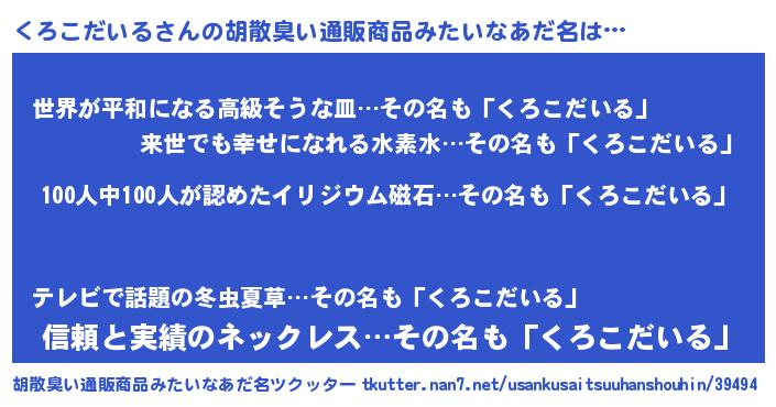 くろこだいるさんの胡散臭い通販商品みたいなあだ名をツクッター!