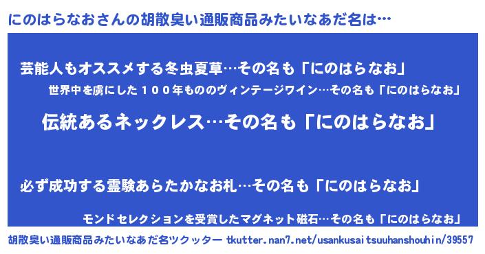 | 男性向けラノベタイトル風あだ名 | 『転生したらにのはらなおだった件』 |