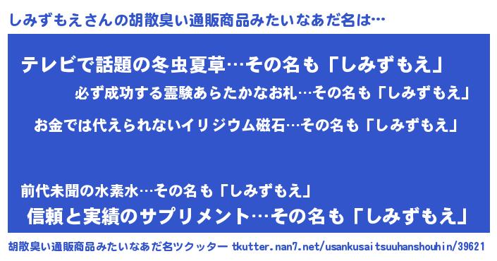 | 女子向けラノベタイトル風あだ名 | 『しみずもえ恋絵巻』『闇のしみずもえ』 |