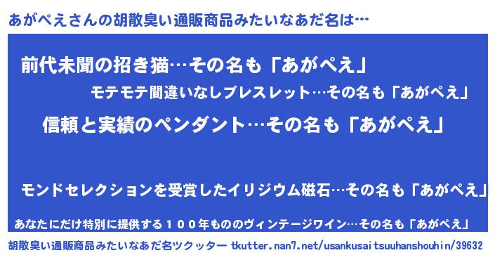 | 男性向けラノベタイトル風あだ名 | 『ダンジョンにあがぺえを求めるのは間違っているだろうか』 |