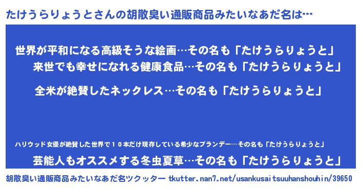 | 男性向けラノベタイトル風あだ名 | 『たけうらりょうとの嫁は女の子じゃないと思った?』 |