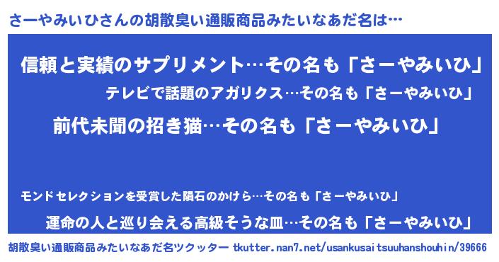 | 意味不明あだ名 | 『永久保存さーやみいひ』 |