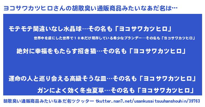 | 男性向けラノベタイトル風あだ名 | 『ヨコサワカツヒロスレイヤー』 |