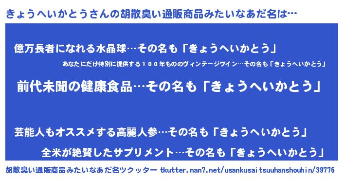 | 意味不明あだ名 | 『永久保存きょうへいかとう』 |