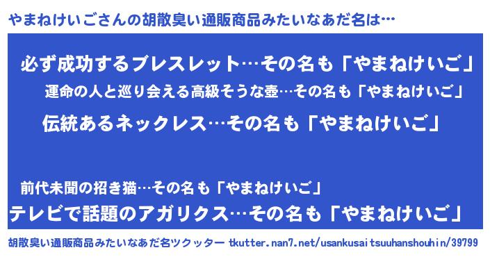 | 欧米人風あだ名 | 『ウサインやまねけいご』 |