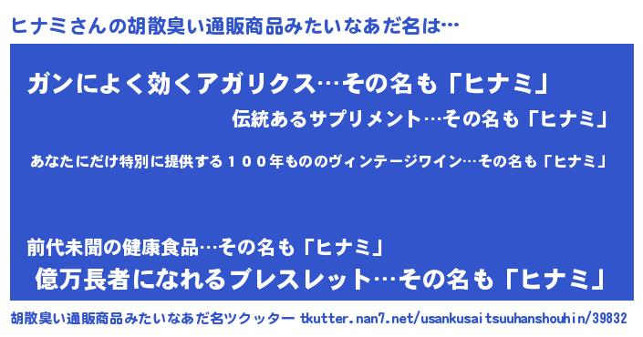 | 意味不明あだ名 | 『住所不定無職ヒナミ(5歳)』『自称ヒナミ』 |