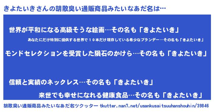 | 男性向けラノベタイトル風あだ名 | 『きよたいきに滅ぼされるだけの簡単なお仕事です』 |