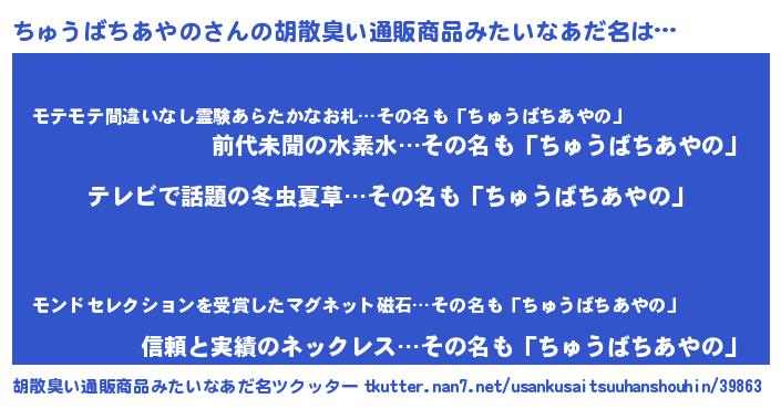 | 男性向けラノベタイトル風あだ名 | 『転生したらちゅうばちあやのだった件』 |