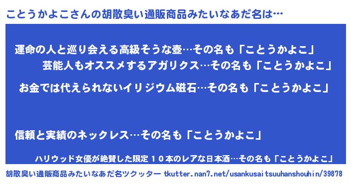 | ヘコむあだ名 | 『豆乳』『ことっ子』『ことっふぃ~』 |