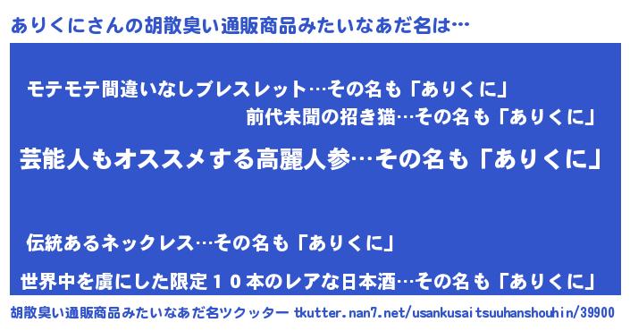 | 男性向けラノベタイトル風あだ名 | 『Re:ありくにから始める異世界生活』 |