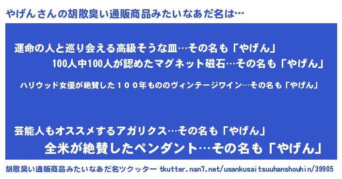 | 意味不明あだ名 | 『住所不定無職やげん(11歳)』『自称やげん』 |