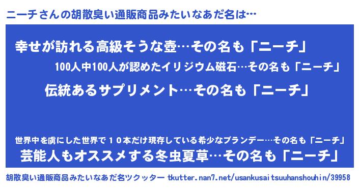 | 意味不明あだ名 | 『とにかく怪しいニーチ』『自称ニーチ』 |