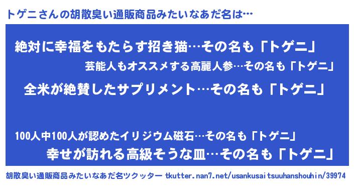 | ヒーロー風カッコイイあだ名 | 『炎刃騎士トゲ』『ネオトゲニ』 |