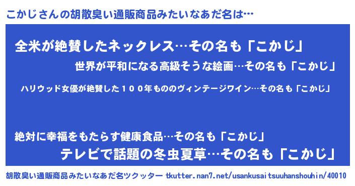 | 男性向けラノベタイトル風あだ名 | 『緋弾のコカジ』『はたらくこかじさま!』 |