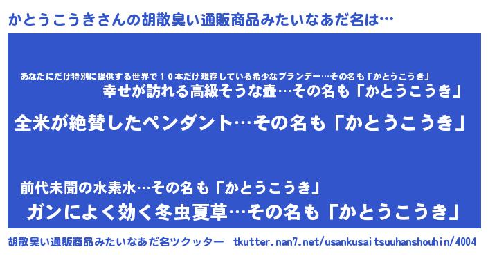 | 意味不明あだ名 | 『とにかく怪しいかとうこうき』 |