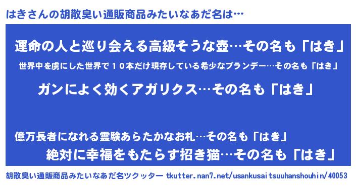 | ヘコむあだ名 | 『つくし』『はき(笑)』『はきにー』 |
