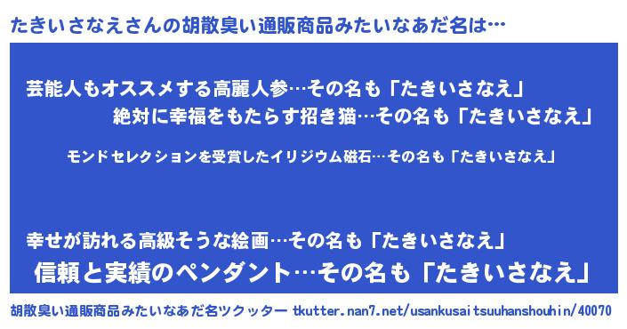 | ヘコむあだ名 | 『たき太郎』『たきいさなえ(小並感)』 |