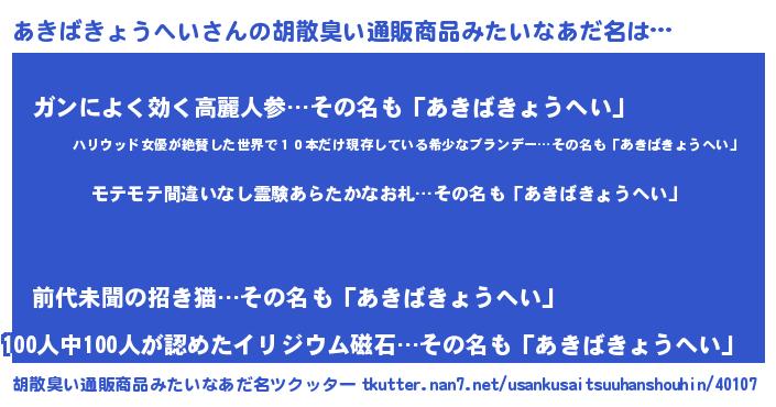 | ヘコむあだ名 | 『あきもー』『あきばきょうへい(小並感)』 |