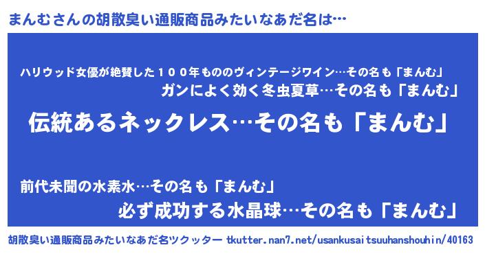 | 男性向けラノベタイトル風あだ名 | 『転生したらまんむだった件』 |