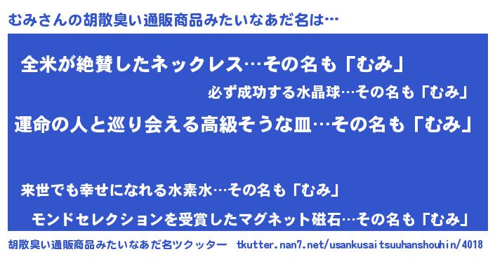 | 男性向けラノベタイトル風あだ名 | 『むみ~年齢イコール彼女いない歴の魔法使い~』 |