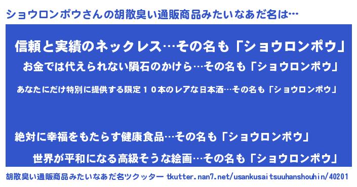| 意味不明あだ名 | 『住所不定無職ショウロンポウ(53歳)』 |