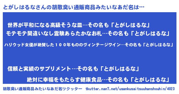 | 意味不明あだ名 | 『住所不定無職とがしはるな(12歳)』 |