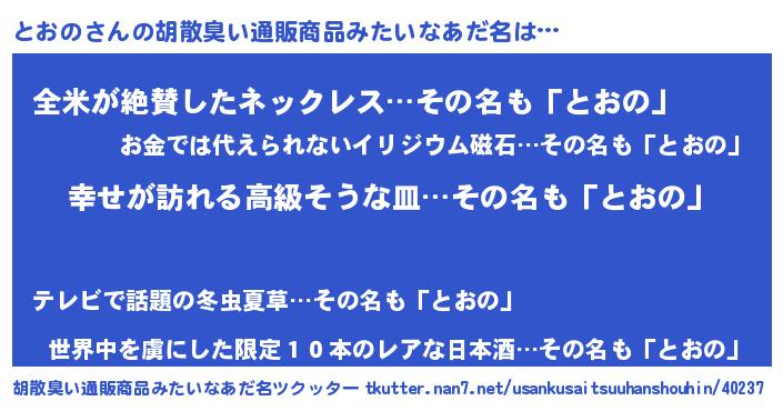 | 欧米人風あだ名 | 『アンジェラ・とおの』『ウサインとおの』 |