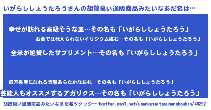 | 男性向けラノベタイトル風あだ名 | 『いがらししょうたろうに滅ぼされるだけの簡単なお仕事です』 |