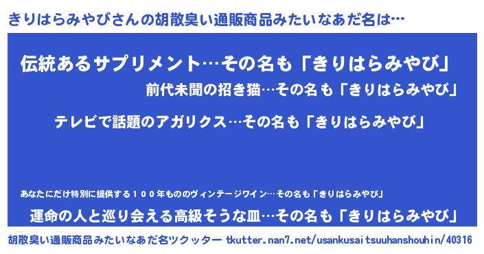 きりはらみやびさんの胡散臭い通販商品みたいなあだ名をツクッター!