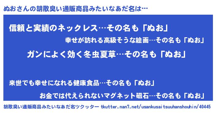| 男性向けラノベタイトル風あだ名 | 『魔法科高校のぬお』『ヌオスレイヤー』 |