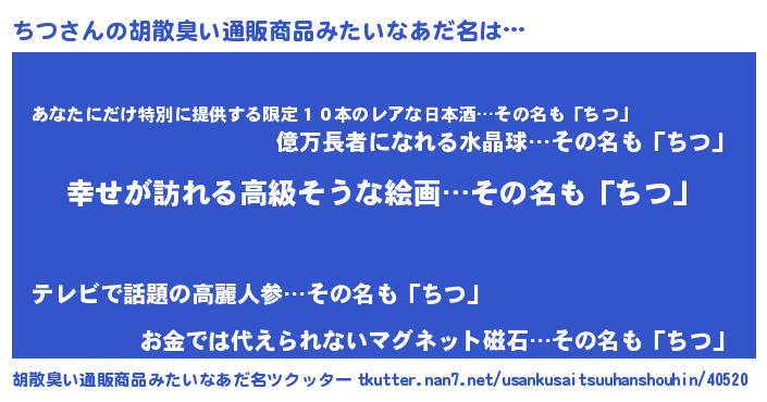 | 女子向けラノベタイトル風あだ名 | 『ちつの雑貨屋さん』『死神ちつの再婚』 |