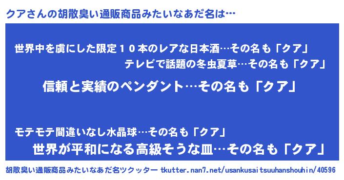 | 意味不明あだ名 | 『とにかく怪しいクア』『自称クア』 |