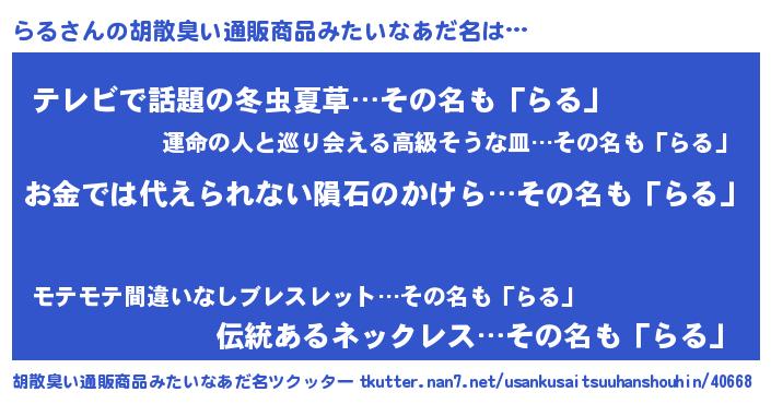 | ヘコむあだ名 | 『らるぷりん』『つくし』 |