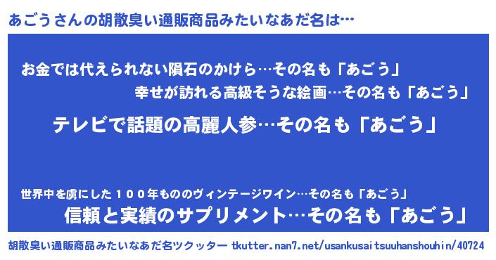 | 意味不明あだ名 | 『自称あごう』『眠気覚ましガムあごう味』 |