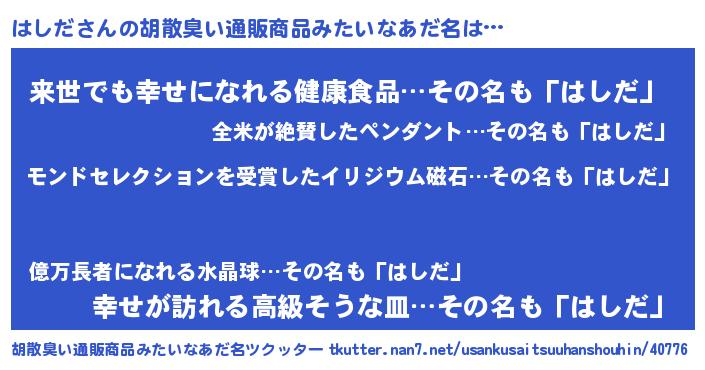 | ヒーロー風カッコイイあだ名 | 『慈愛の使者はしだ』『ネオハシダ』 |