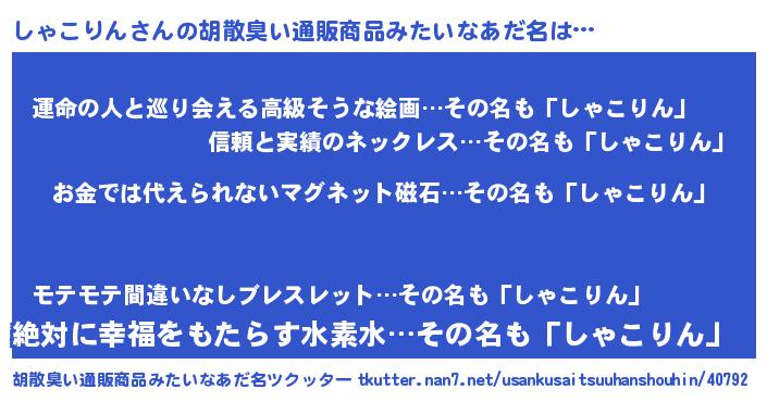 | ヒーロー風カッコイイあだ名 | 『愛の使者しゃこりん』『ネオシャコリン』 |