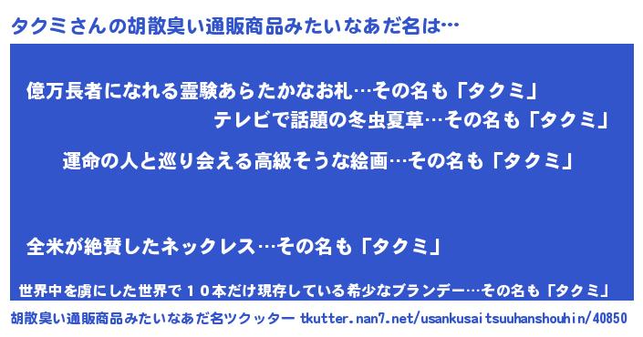 | 欧米人風あだ名 | 『タクミクリステル』『マイケルタクミ』 |