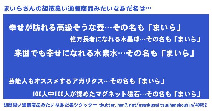 | 意味不明あだ名 | 『永久保存まいら』『まいらフォーエバー』 |