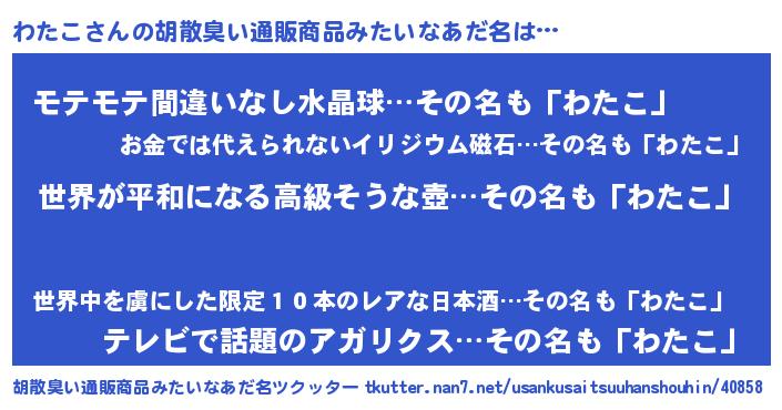 | ヘコむあだ名 | 『なまこ酢』『わたにゅー』 |