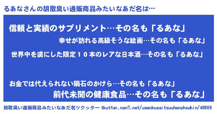 | ヘコむあだ名 | 『るあっ子』『るあな(笑)』 |