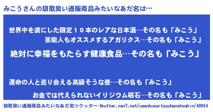 | 男性向けラノベタイトル風あだ名 | 『ミコウスレイヤー』『魔弾の王とみこう』 |
