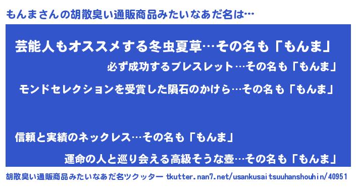 | 意味不明あだ名 | 『ヨモギ科もんま属』『自称もんま』 |
